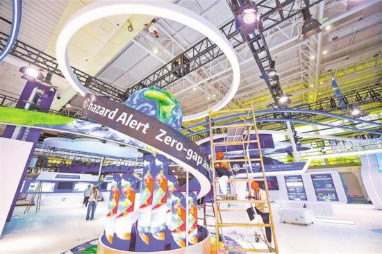 智慧氣象展以藍白色為主色調,南京新環光電科技有限公司、中國航空工業集團民機試飛中心等企業和機構,將通過各種形式展出氣象領域各類科技成果和新型裝備等。