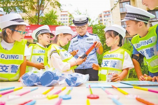 8月27日,交警為孩子們講解安全器材使用方法。當天,銀川市金鳳區長城中路街道五里水鄉社區聯合金鳳區交警二大隊、金鳳區綜合執法局,在開學前夕共同舉辦了一場別開生面的青少年安全教育主題活動,吸引轄區內眾多中小學學生積極參與。記者 李宏亮 攝