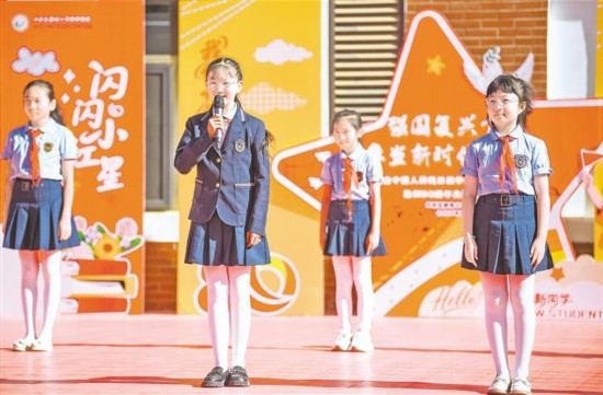9月1日,銀川市興慶區唐徠小學開學典禮上,孩子們朗誦詩歌《光在紙上行走》。當日,全區多地學校迎來開學第一天,孩子們在多姿多彩的活動中共上“開學第一課”。 記者 馬楠 王洋 攝