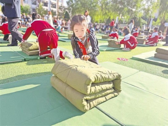 9月24日,同學們參加疊被子比賽。當天,全區首屆中小學生勞動技能競賽暨展示交流活動在賀蘭縣第三小學舉行,來自全區20余支代表隊的560名參賽選手同場競技,展現勞動技能風采。 記者 王若英 攝