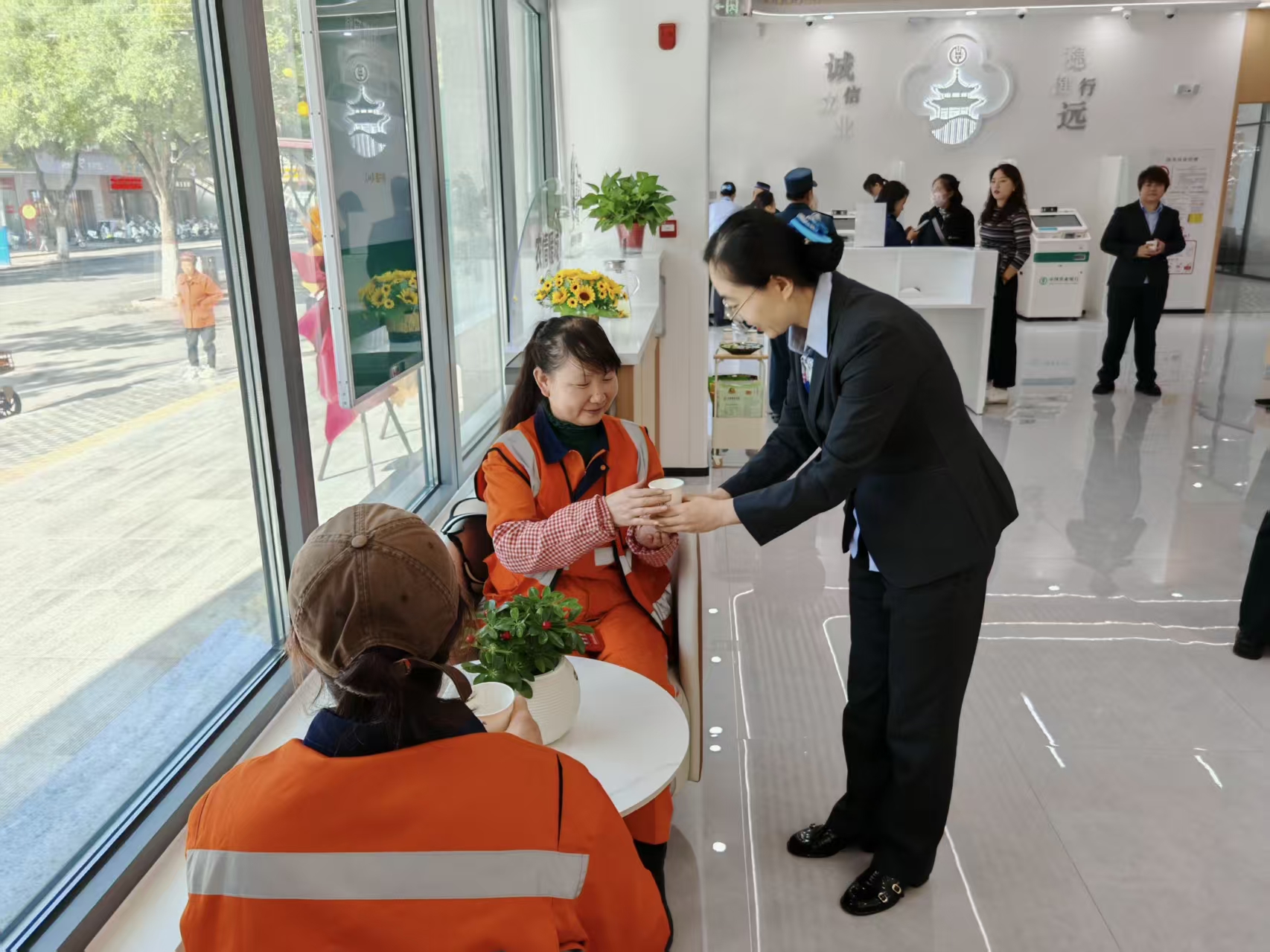 該行精心打造的“工會驛站”茶歇專區,已成為戶外勞動者的溫馨港灣??爝f員、環衛工人、出租車司機等群體可在此免費飲水、充電休憩,緩解工作疲憊。驛站還借助智能電子屏循環播放金融知識短視頻,工作人員現場講解防詐騙、存款保險等內容,幫助戶外勞動者增強金融風險防范意識,實現“歇腳充電”與“知識充電”兩不誤。在靈武支行營業部煥新開業之際,網點特邀十余位環衛工人走進網點參觀體驗。環衛工人王女士感慨道:“原來只是好奇看看,沒想到農行不僅環境舒適,還專門為我們設置了休息區,想得太周到了?!?/p>