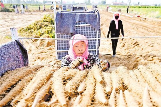 近日,銀川市興慶區月牙湖鄉2000畝白玉山藥迎來集中挖收期,一箱箱筆直粗壯的山藥從沙土中被“請”出,源源不斷地運往全國各地。