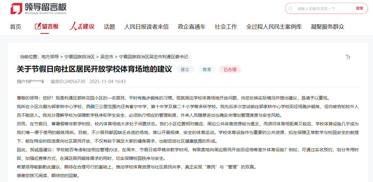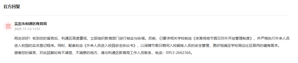 收到留言后,吳忠市利通區教育局作出公開回復:利通區立即組織教育部門進行核實與協調。目前,已要求相關學校制定《體育場地節假日對外開放管理制度》,并嚴格執行外來人員進入校園的實名登記程序。同時,配套擬定《外來人員進入校園安全協議書》,以保障節假日期間入校鍛煉人員的安全管理,更好地滿足學校周邊社區居民的健身需求。